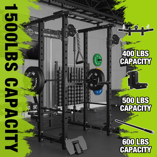 Power Rack Cage, 1500LBS Weight Cage with 800LB Capacity Adjustable Weight Bench, Multi-Function Workout Rack Cage with Storage System, J-Hook, Band Peg, Battle Rope Ring Home Gym